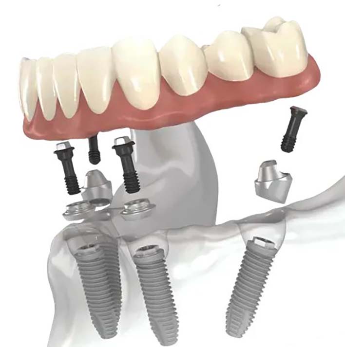 全口种植牙只需要在牙槽骨中植入一定数量的种植牙体,就可以用固定方式支持全口/半口义齿。一般单颌(半口)需要4-6颗种植体为义齿提供足够的支持。